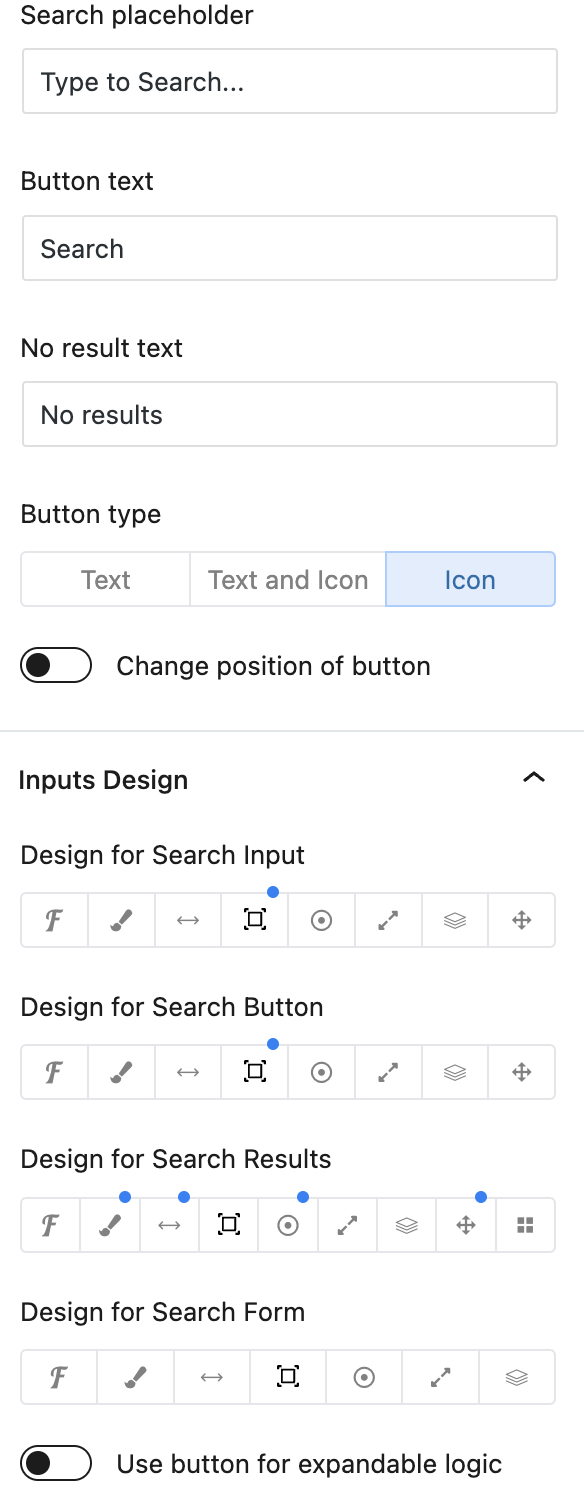 Search block has separate design options for search input, button and form. You can combine them to make unique look.